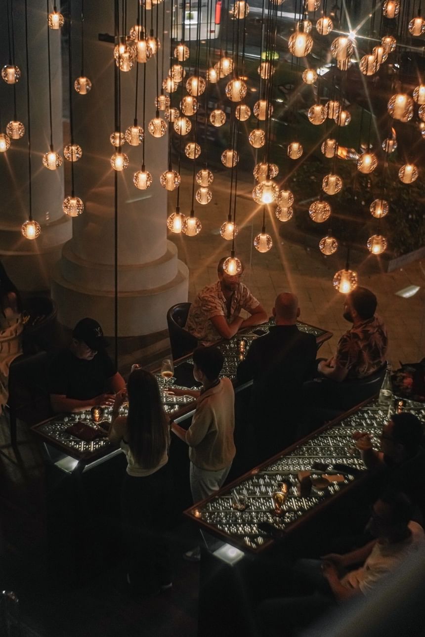 Bartender pouring a drink at a lit bar, surrounded by guests and shelves of bottles in 2 Lam Son at Park Hyatt Saigon