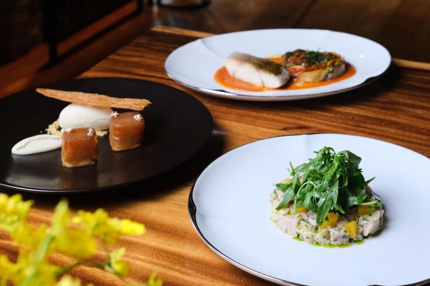 Được phục vụ theo lựa chọn hai hoặc ba món, thực đơn luân phiên thay đổi qua bốn tuần, phản ánh những bước đi riêng biệt mà gắn bó của ẩm thực Pháp – Việt, giữa tươi mới và chiều sâu, giữa di sản và sự táo bạo. Dưới bàn tay của Bếp trưởng Arnaud Schuttrumpf, các món Pháp được chăm chút khéo léo, kể đến như Tabbouleh kết hợp các loại hạt hữu cơ, cam tươi và cải xoăn giòn; ức gà nướng ăn kèm nấm theo mùa và xốt gà cô đặc; bánh táo Tatin dùng với kem tươi và chút bất ngờ từ trứng cá cần tây. Với Bếp trưởng Ninh Lê Trung Hậu, hương vị Việt trở lại đầy duyên dáng trong một hình hài mới mẻ: phở cuốn bò Wagyu, gà xào chua ngọt cùng ớt chuông và hành tây, hay món sữa chua trân châu Hạ Long kiểu mới với sốt dừa, kem sữa chua và trân châu dẻo thanh mát.